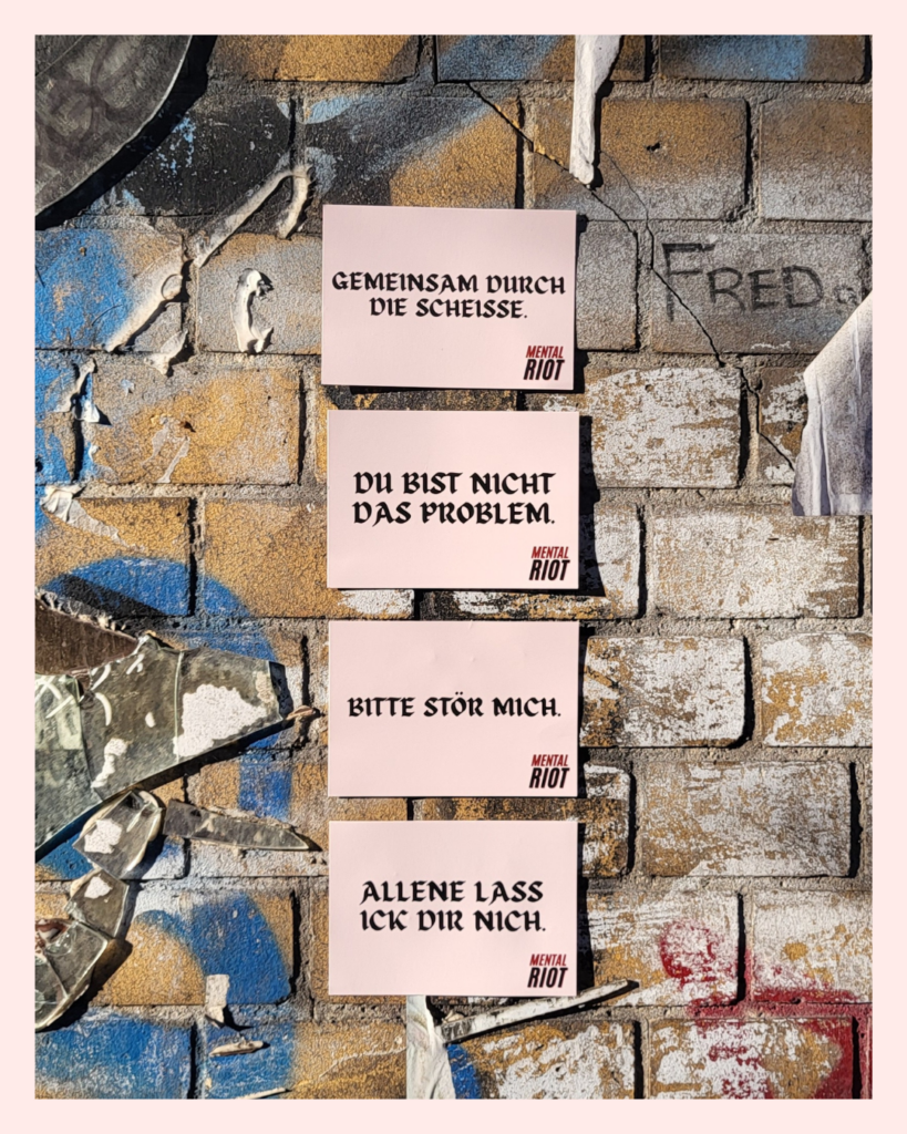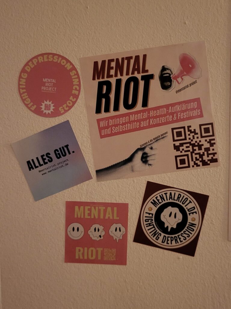 Zeig es der Welt: Mental Riot erstellt eigene Flyer, Broschüren, Sticker und Co. Wir laden dich herzlich ein, eine Bestellung über das Kontaktformular zu tätigen und Mental Riot in deiner Nähe bekanntzumachen. Alle Besteller:innen bitten wir um eine kleine Spende. Damit decken wir die Kosten von Druck, Verpackung und Versandkosten. Aktuell erhalten wir keine Förderung und finanzieren uns mittels Spenden und privatem Geld. Mehr dazu auf der Seite Transparenz.